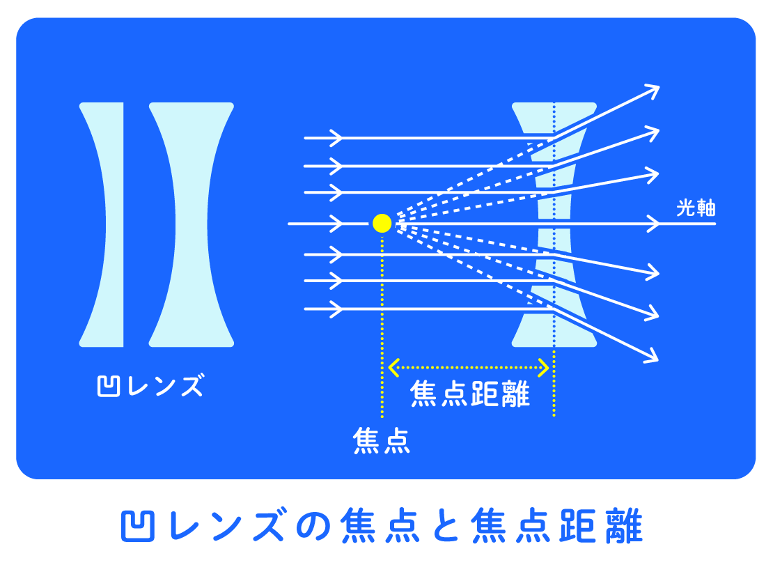 そしてレンズを通して屈折した光線の束が一か所に集まる点のことを「焦点」といいます。凹レンズでは、広がる光を反対向きに延長させたところに焦点があります。また、レンズから焦点までの距離を「焦点距離」といい、レンズの厚みやレンズ表面の曲がり方で距離が変わります。顕微鏡やカメラ、望遠鏡などは、凸レンズと凹レンズを組み合わせてこの焦点距離を調節し、小さなものを大きくして見たり、遠くのものを近くに見たりすることができるのです。