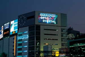 | ふたつのネオンとも、大型のオリンパスロゴが配置されていますが、屋外広告塔用としては前例のない、最新の光源である青色LEDを用いています。