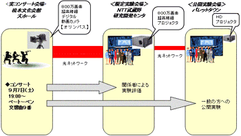 | サイトウ・キネン・フェスティバル松本(総監督:小澤征爾)※1は、本年のフェスティバルにおいて、オリンパス光学工業株式会社、日本電信電話株式会社、日本ビクター株式会社と共同で、臨場感あるコンサートの模様を遠隔地でも楽しめるようにと、光ネットワークを活用した映像による「光ネットライブコンサート」の実験を、一般の皆様向けと技術関係者向けに、下記の通り実施いたします。