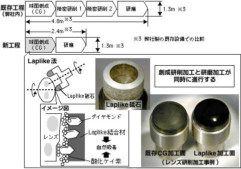 | このたび開発したレンズ研削・研磨統合技術「Laplike法」は、研削初期工程(カーブジェネレーティング(球面創成)工程)で使われている既存の研削加工機に専用砥石を付け替えるだけで、その後工程である精密研削工程を不要とし、最終の研磨工程に移ることが可能です。これにより、レンズ研削・研磨に関わる設備・設置スペースを半減。同時に工程間の設置に関わる作業工数・時間も削減できます。さらに、精密研削工程で発生する被加工対象物の除去(削り)量が少なく、バラツキも抑えられるため、素材容積・コストの削減はもとより、レンズの中心厚さ精度も±0.03mmから±0.01mmに向上しました。 | |||||||