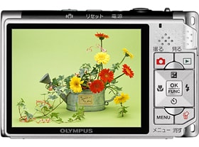 2.5型の液晶モニターに比べ約1.5倍の大きさで文字や画像を表示する3.0型の大型液晶モニターを搭載しています。23万画素の高精細な液晶モニターは画像をクリアに映し出すので、撮影した画像の鑑賞にも適しています。また、オリンパス独自のブライトキャプチャーテクノロジーにより、暗い場所でも自動的に被写体を明るく映し出すので、場所を選ばずに快適に使用できます。また薄さ21mmの薄型でコンパクトなデザインなので、旅行や日常的に持ち歩くのに便利です。