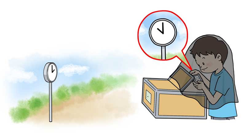 わかりやすい風景を選んで、その方向にだんボール箱の小さい丸い穴を向けます。